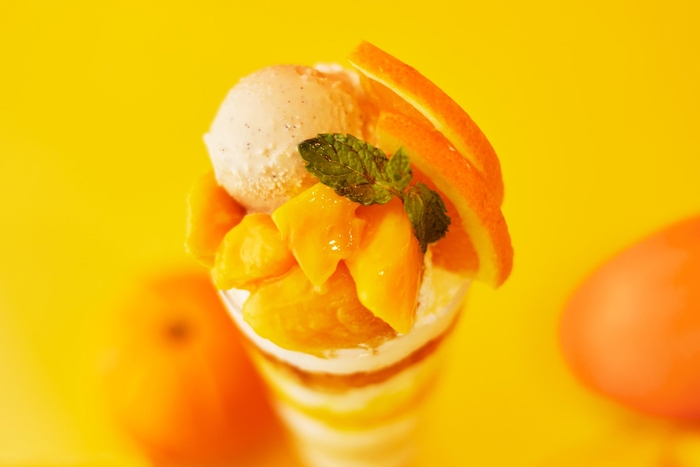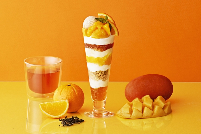 東方美人茶のオリジナルゼリーやパンナコッタ、シナモングラノラをベースに、マンゴーとオレンジ、レモンクリームダージリンジェラートをトッピングしました。ゼリーやパンナコッタの優しい甘さと果肉と果汁がたっぷりのオレンジソースの爽やかな酸味が織りなす贅沢パフェです。