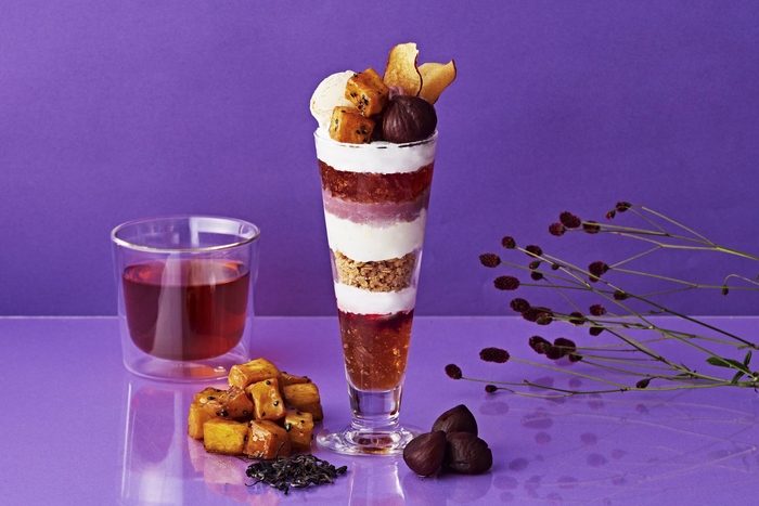 東方美人茶のオリジナルゼリーやパンナコッタ、シナモングラノラをベースに、こっくりした紅いもモンブラン・大学芋・栗渋皮煮・さつまいもチップスなどの秋の味覚をたっぷりと詰め込んでいます。フランボワーズソースのアクセントや黒糖鉄観音ジェラートをトッピングすることで、さまざまな味の変化を愉しめる贅沢パフェです。
