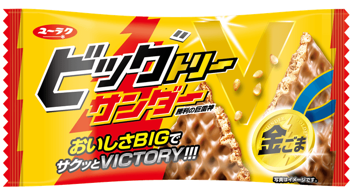 ・様々な場面で勝利をつかむ「ゲン担ぎ」になるようキラキラ光る、金色のパッケージを採 用。「BIG」「VICTORY」を合わせた「ビッグトリーサンダー」と大きく打ち出した商品です。
