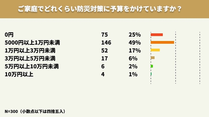 ご家庭でどれくらい防災対策に予算をかけていますか?と聞いたところ、0円25%、5000円以上1万円未満49%、1万円以上3万円未満17%、3万円以上5万円未満6%、5万円以上10万円未満2%、10万円以上1%となっており、手頃な価格での対策に留まっているという結果がでました。防災への意識は高いとしても、しっかり予算をかけて対策している方は少数というのが実情なようです。