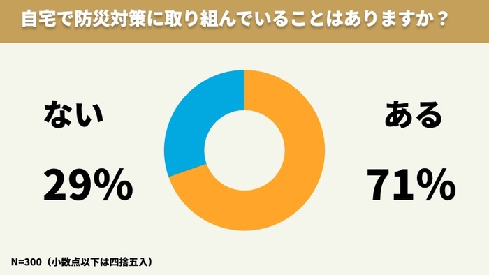 自宅で防災対策に取り組んでいることはありますか?と聞いたところ、「ある」が70.67%、「ない」29.33%という結果になりました。