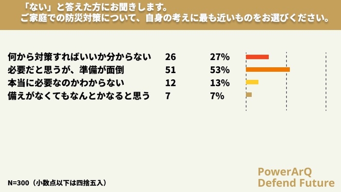 自宅で防災対策に取り組んでいることが「ない」と答えた方に理由を訊ねたところ、「何から対策すればいいか分からない」27%、「必要だと思うが、準備が面倒」53%、「本当に必要なのかわからない」13%