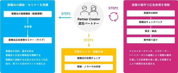 育成対象となるクリエイターは、クリエイターズマッチの認定パートナークリエイターで、バナー・LP制作の実績がある方になります。STEP1では、ビズテーラー・パートナーズが提供する薬機法研修「薬機法スタディテーラー」をクリエイター向けにカスタマイズした講座やセミナーを受講します。STEP2では、実際の案件で実績・経験を積むことで適正な広告表現や効果を出す方法を身につけてゆきます。STEP3では、薬機法の定期チェックおよび事例を定期的に共有することでレベルを継続的に維持してゆきます。