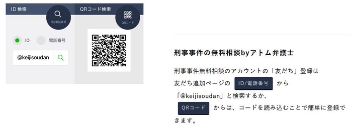 ①ID検索またはQRコードを読み取り、事故の無料相談byアトム弁護士/刑事事件の無料相談byアトム弁護士のLINEアカウントを「友だち追加」