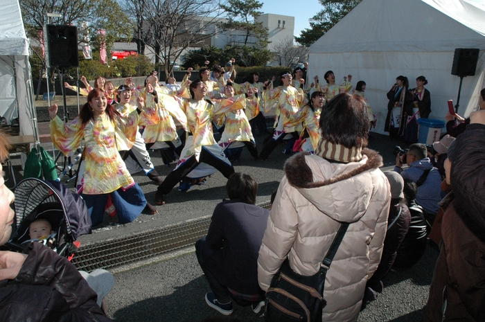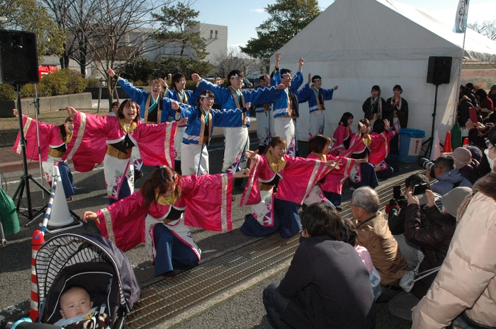 岡山理科大学(岡山市北区理大町)などの学生でつくる愛好会「岡山うらじゃ連 四季(平野葉月代表)」が2020年1月18日(土)、岡山市南区の岡山市中央卸売市場で開かれた「市民イチバデー」に出演。華麗なうらじゃ踊りを披露し、家族連れらを楽しませました。