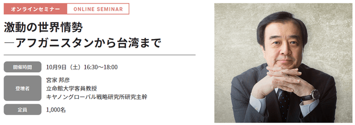 2021年10月9日(土)、立命館大学と立命館大学校友会は、「オール立命館 校友の集い2021」をオンラインで開催します。同日16:30~18:00、どなたでも参加(視聴)可能なライブ配信企画:オンラインセミナー「激動の世界情勢―アフガニスタンから台湾まで」を実施します。講演は、宮家邦彦(立命館大学客員教授・キヤノングローバル戦略研究所研究主幹)が務めます。