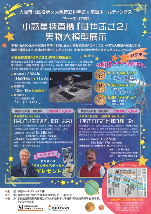 大阪市北区役所×大阪市立科学館×京阪ホールディングス アートエリアB1 小惑星探査機『はやぶさ2』実物大模型展示と関連講演、 3つの施設をめぐるキーワードラリーを開催します。