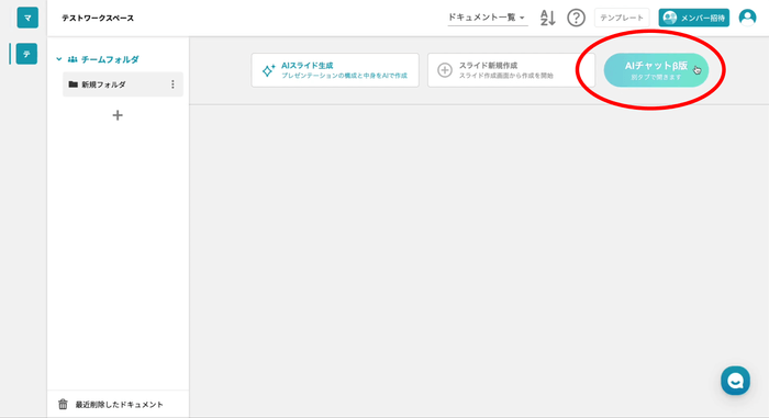 まず、ログイン後の画面右上に表示される「AIチャットβ版」のアイコンをクリックすると、別タブでチャット画面が開きます。