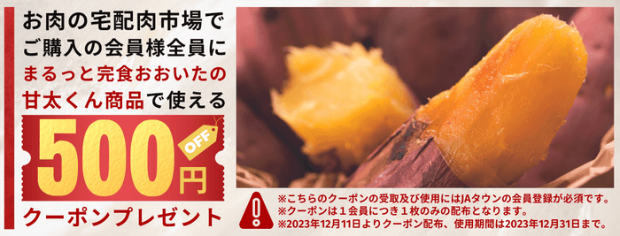 このキャンペーンでは、11月13日~11月27日の期間に「まるっと完食おおいた~美味しいもんいっぱい送っちゃんけん~」で商品を購入した方には「お肉の宅配 肉市場」で販売中のすべての商品で後日使用できる500円引きクーポンをプレゼントし、「お肉の宅配 肉市場」で商品を購入した方には「まるっと完食おおいた~美味しいもんいっぱい送っちゃんけん~」で販売中のさつまいも「甘太くん」で後日使用できる500円引きクーポンをプレゼントします。