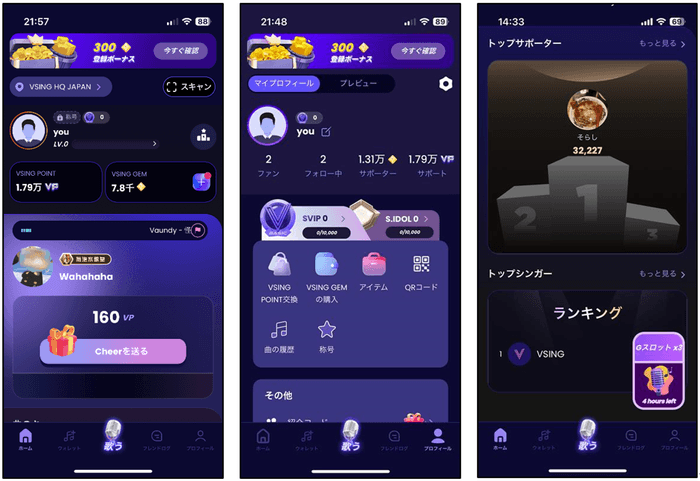 VSINGアプリでは、VSING体験(歌う曲選びやCheerのギフトなど)の全ての操作を行うことができます。