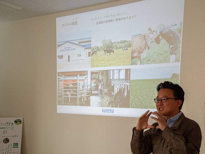 カネカが運営する牧場では、「“牛にやさしい、人にやさしい、地球にやさしい”」酪農を目指しており、牛のエサは、牛のフンをもとに肥料を作り、その肥料でコーンを育て、そのコーンをエサとして与えるといった循環型酪農を行っています。