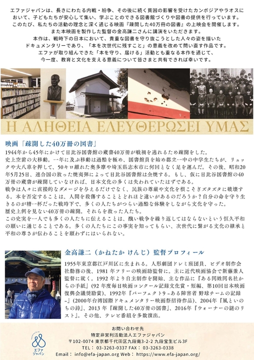 戦火から「図書を守る」とは?映画「疎開した40万冊の図書」上映と金高謙二監督の講演会開催