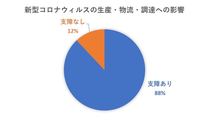 日本企業を対象(n=12,966)にしたアンケート結果、新型コロナウィルスによって日本企業の88%が生産・物流に支障と回答した。問題が生じていないとする企業は12%にとどまり、事態の深刻さが明らかになりました。