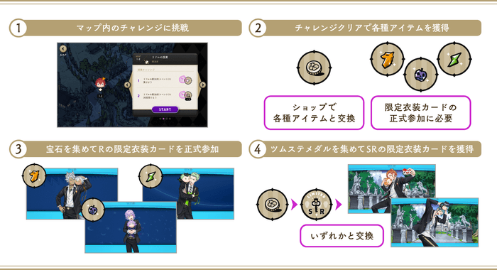 ※既に限定衣装カードを所持している場合、本イベントにおいて期間限定参加の条件を満たした段階でプレゼントボックスに同じカードが1枚送られます。