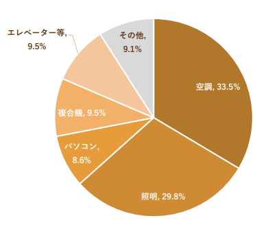 オフィスの消費電力のうち空調が約34%、照明が約30%を占めます。