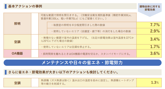 照明を半分程度間引きすると7.7%、使用していないエリアの消灯でも約3%の節電となります。