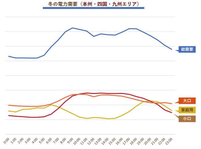 夏季との電力需要の違いは、夕方以降の電力需要も多いことです。夜間、早朝などは日中よりも気温が下がるため、暖房を使う時間が多くなります。