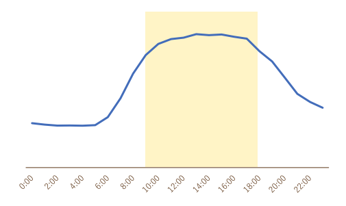 オフィスにおいては、一般的に9時~18時頃に高い電力消費が続く傾向があります。