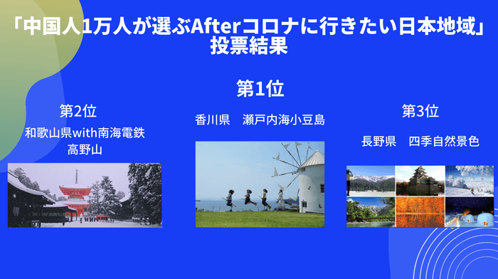 一般社団法人日中ツーリズムビジネス協会(本社:東京都新宿区、代表理事:王璇)は、日中間のツーリズムビジネスの再開を目指し、2020年12月18日に業界初の日中越境オンラインサミット「日中ツーリズムサミット2020」を開催しました。そして、初めてとなる、中国現地1万人が選ぶ「Afterコロナに行きたい日本地域」の投票を実施した結果、香川県・瀬戸内海小豆島が3430票(全体34%)の総得票数に達し、1位を獲得しました。