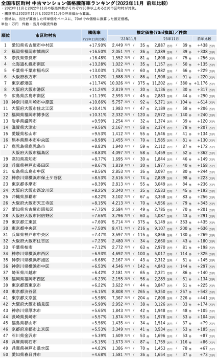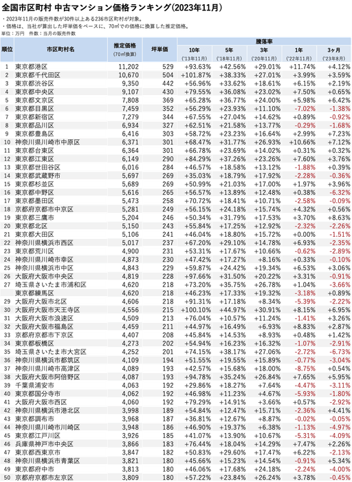 「マンションレビュー」2023年11月 全国市区町村 中古マンション価格/騰落率ランキング100を発表