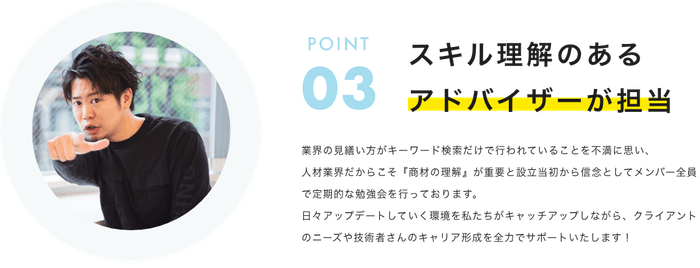 立ち上げ当初より他社エージェントへのコンサルティングを行なってきた中で技術者へのキャリア相談、面談テクニックの教授、経歴書やポートフォリオの記載アドバイスなど対外的にも技術者の支援を行なってきた。