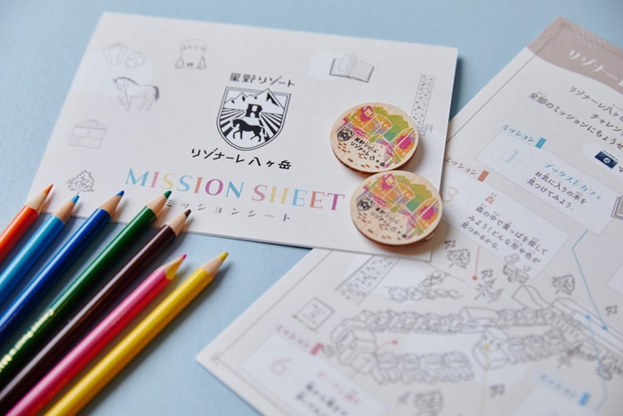 ウェブサイトのクイズに全問正解すると「ヒミツのあいことば」が手に入ります。ホテル到着後、「ヒミツのあいことば」を伝えると、ミッションシートがもらえます。ミッションは、ホテル内に点在するポイントを巡りながら写真撮影をしたりクイズに答えたりと、子どもが意欲的に楽しめる内容です。ミッションを達成すると、リゾナーレ八ヶ岳オリジナルの記念バッジがもらえます。