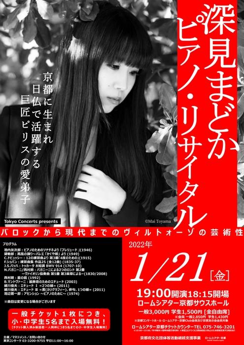 ピアニスト・深見まどかは、このような本格派のプログラムこそ、「ピアノを学習する小学生・中学生にぜひ触れて欲しい、聴いてもらいたい」と考えており、1/21(金)ロームシアター京都サウスホールでの公演は、「チケット購入済み保護者1人につき5名までの小・中学生入場無料!」といたしております。