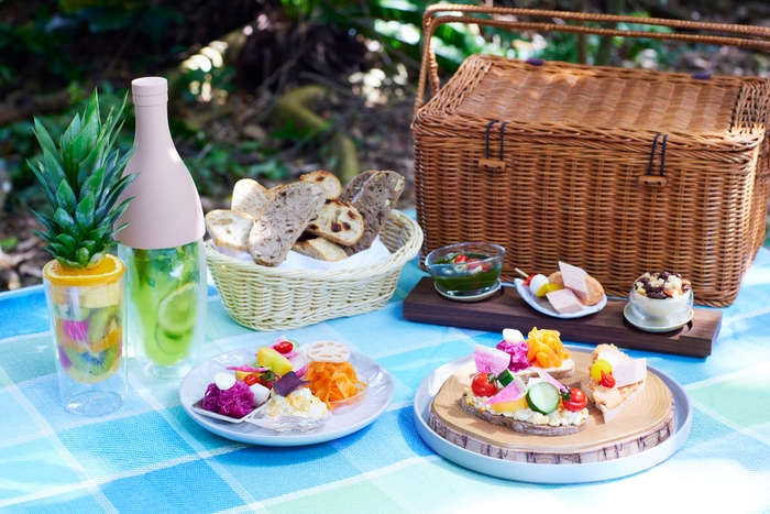 2日目の昼食には、ピクニックBOXを用意します。BOXの中には、3種類のパンと黒糖クリームチーズのパテや、紅いものポテトサラダ、スパムなどが入っており、好きなものを好きなようにトッピングする、オープンサンドを楽しめます。ホテル敷地内にあるジャングルエリアで、ピクニックシートを敷いて、木漏れ日を浴びながらゆったりと昼食の時間を過ごせます。