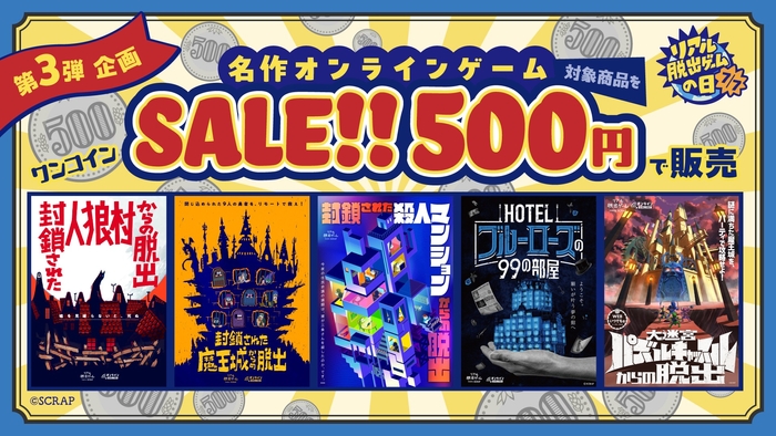 2025年7月7日(月)から7月20日(日)までの期間限定で、対象のオンラインゲームをワンコイン(500円)で楽しめる大セールを実施。対象ゲームには、これまでに発売されたオリジナルオンラインゲームの中で最もプレイされた『封鎖された魔王城からの脱出』や、SCRAP初のミステリーノベルゲームとして登場し、爆発的ヒットを記録した人気作『HOTELブルーローズの99の部屋』など、全5タイトルをラインナップ。