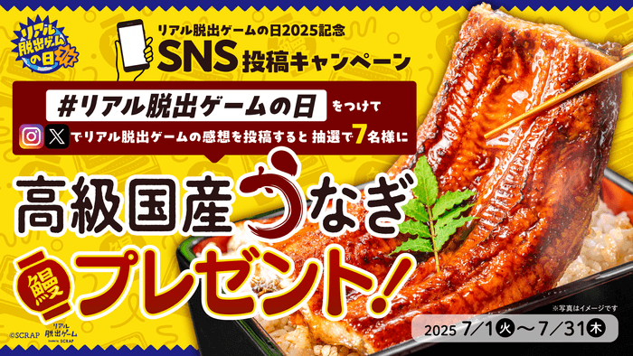 2025年7月1日(火)~2025年7月31日(木)の期間、InstagramまたはXで「#リアル脱出ゲームの日」のハッシュタグを付けて、リアル脱出ゲームの感想を投稿すると、高級国産鰻が抽選で7名様に当たる「リアル脱出ゲームの日2025記念 SNS投稿キャンペーン」を開催します。