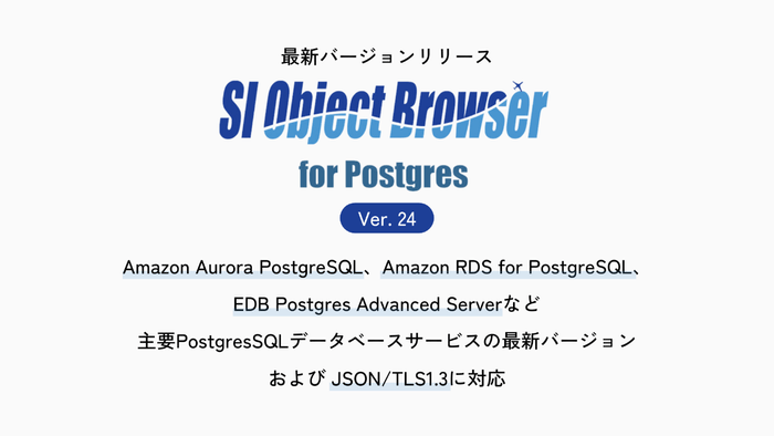 最新バージョンでは、オープンソースリレーショナルデータベース管理システムの「PostgreSQL 16」、エンタープライズDB株式会社が提供する「EDB Postgres Advanced Server 16」、アマゾン ウェブ サービス(AWS)の「Amazon RDS for PostgreSQL 16」および「Amazon Aurora PostgreSQL 16」に対応しました。
