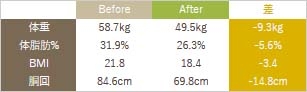 平均で体重-5.9kg、ウエスト-9cm!一足お先に「8週間ダイエット献立セット」を実行した方たちには、ダイエット*成功者が続々誕生しています。体重、ウエスト以外にも平均で体脂肪率-3%、BMI-2.4など、確かな結果が実証されています。