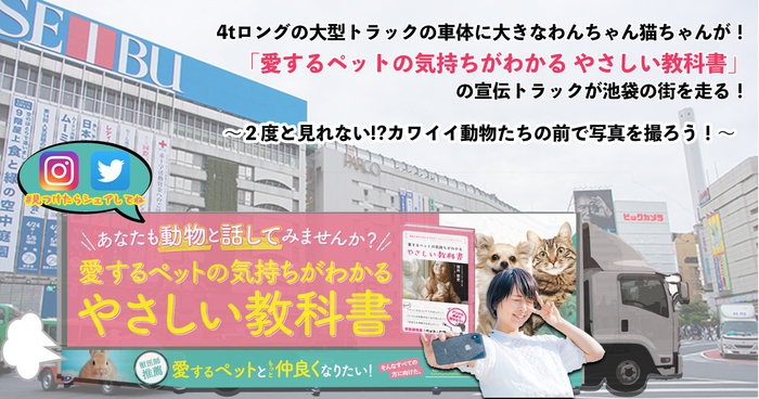 4tロングの大型トラックの車体に大きなわんちゃん猫ちゃんが! 「愛するペットの気持ちがわかる やさしい教科書」 の宣伝トラックが池袋の街を走る! | NEWSCAST