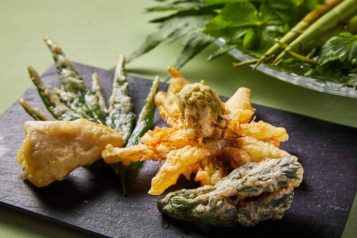 お客さまが収穫した山菜を、自らが調理して楽しむメニューです。テーブル上の小型のフライヤーで揚げて、フリットにし、熱々の出来立てを味わえます。葉の厚いものや茎のあるものなど山菜の特徴に合わせた調理時間をスタッフに聞きながら、一番美味しい状態で仕上げます。味付けは、シンプルに塩のみ。見た目や味、香りといった違いやサクサクの食感を楽しめます。