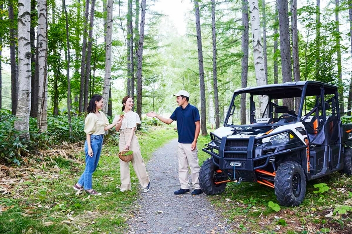 ディナーで味わう山菜は、山菜に詳しいガイドとともに当リゾート内の森で探します。ガイドが運転するバギー(*3)に乗って出かけるので、アウトドアが心配な方も安心です。葉の形状や、香り、手触りなど、山菜の特徴が分かる図鑑を参考にしながら、探していきます。森では、「タラの芽」「こごみ」「ぜんまい」などさまざまな山菜が見られますが、山菜の成長は1年の天候に影響されるので、どのようなものに出会えるかはお楽しみ。ディナー時、自ら収穫した食材が調理され、味わえる体験は格別です。
