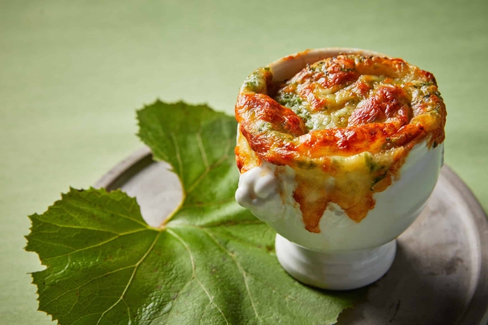 山菜の王様と呼ばれるタラの芽を使ったオニオングラタンスープです。山菜特有の苦みが玉ねぎの甘みにより、マイルドな風味になります。濃厚な味わいのオニオンスープにたっぷりと浸ったパンと、こんがり焼けてとろけたファーム星野のチーズを味わえる一品です。