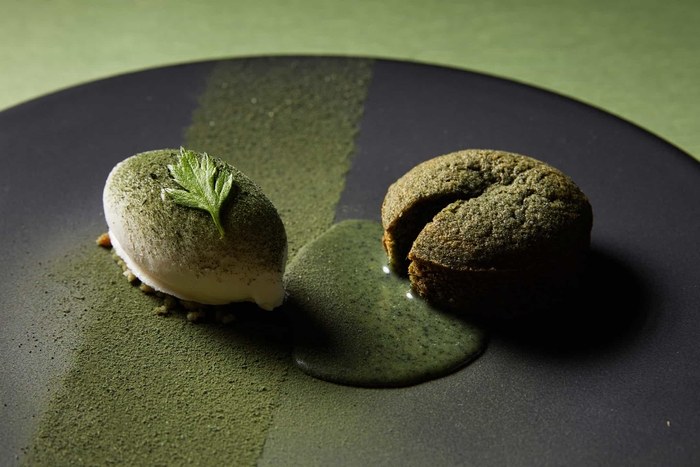 深い緑色が特徴的なヨモギを使ったデザートです。フォンダンショコラをアレンジし、生地やソースにもヨモギをたっぷりと使って焼き上げました。とろりと崩れ出るソースや、当リゾートで飼育する乳牛から搾ったトマム牛乳のミルクジェラートを絡め、豊かな風味とともに味わうのがおすすめです。