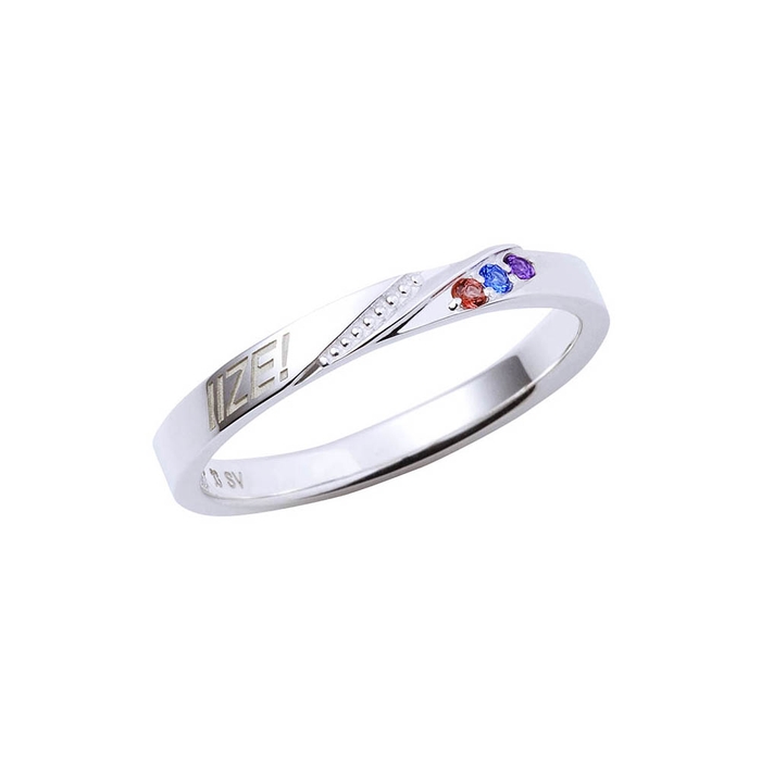 男子アイドルユニット「WITH」のカラーストーン3石をセットした平打ちフォルムの側面には、「IIZE!」をさりげなく刻印。内側には名前刻印を施しました。