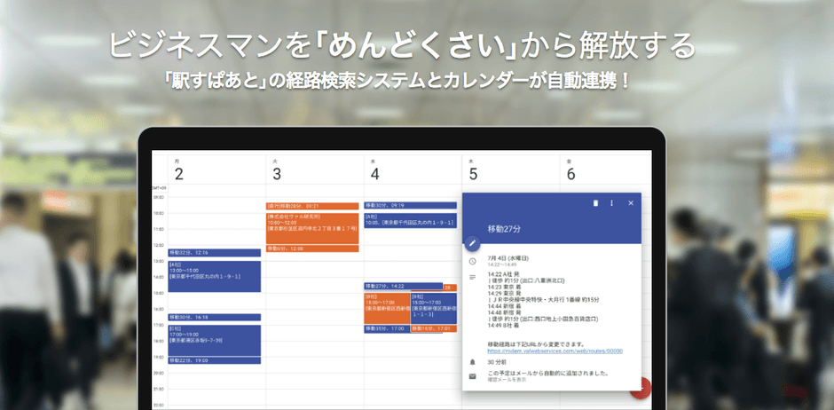 「RODEM」は訪問先をカレンダーに登録するだけで、スケジュール調整・経路検索・交通費精算が済み、作業時間を大幅に削減できるビジネス・サポートサービスです。連携しているカレンダーは「Microsoft Office365 Outlook(R) 予定表」「Googleカレンダー」です。