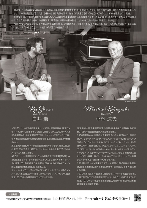 92歳を迎えた、日本音楽会が誇る鍵盤楽器奏者、小林道夫。氏が信頼し、他方では氏を尊敬してやまない、元NHK響ゲストコンサートマスターのヴァイオリニストの白井圭。両者が昨年の共演の後、早く再共演をと願い実現するコンサート。