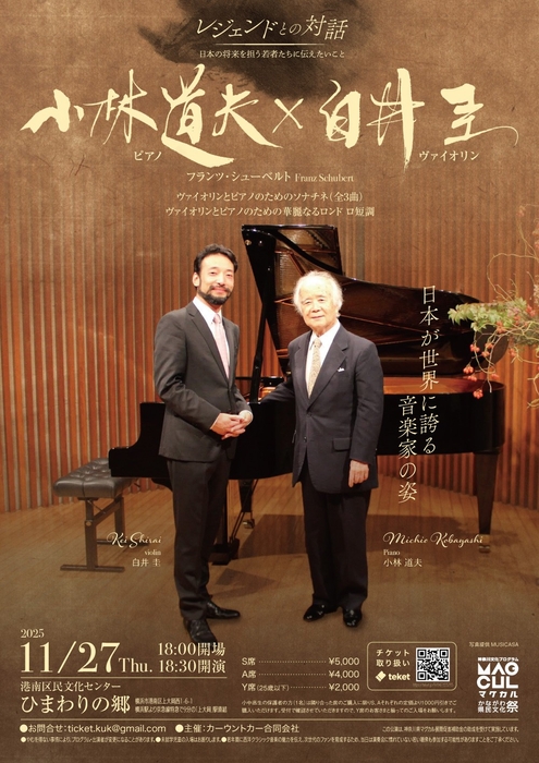 カーウントカー合同会社主催、『小林道夫×白井圭 ~レジェンドとの対話~』が2025年11月27日 (木)に横浜市港南区民文化センター ひまわりの郷 ホール(神奈川県横浜市港南区上大岡西1丁目6-1)にて開催されます。