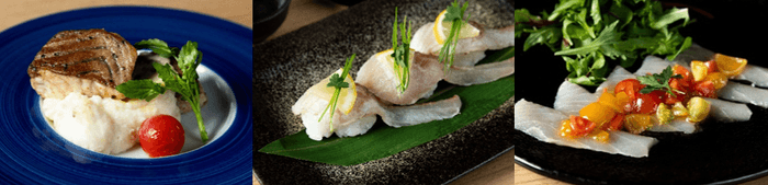 今回提供するメニューは、しっとりと焼き上げたチョウザメをホワイトソースで仕上げた「近大産チョウザメのバターソテー」と、チョウザメを炙ることで、その旨味を存分に味わえる「近大産チョウザメの炙り寿司」、さらに和歌山県産ぶどう山椒オリーブオイルで味付けした「近大産チョウザメのカルパッチョ ぶどう山椒オリーブオイル」の3品です。