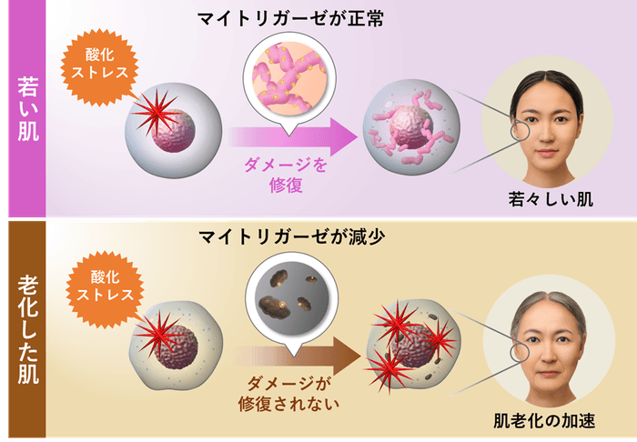 肌が受けたDNAダメージを自ら修復する力は、マイトリガーゼの減少で阻害