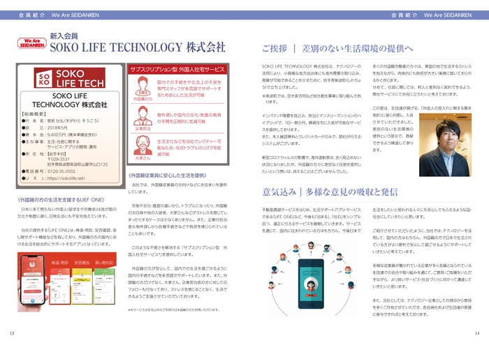 SOKO LIFE TECHNOLOGY は、外国籍の方が邦人と同じ条件で住まいを得られる仕込みを提供するというコンセプトをもと活動しており、生団連が掲げる「外国人の受入れに関する基本指針」に賛同し、入会に至りました。