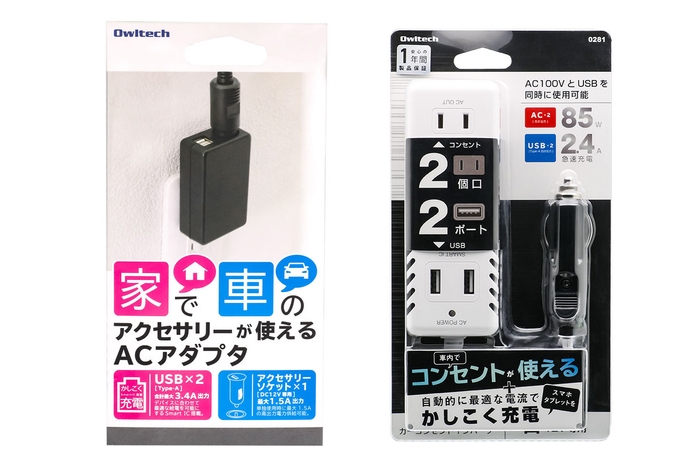 株式会社オウルテック(神奈川県海老名市中新田5-24-1、代表取締役:東海林春男)は、電源関連機器の新製品として、自宅で車載機器が使える電源アダプター「OWL-ACU2D1」と、車の中で家庭用機器の電源が取れる車載インバーター「OWL-DCU2A2」を、12月23日に発売します。