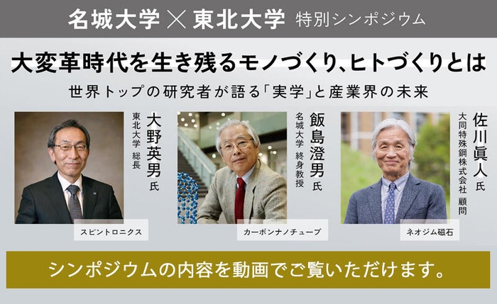 本学と東北大学の共催による特別シンポジウムが3月15日、天白キャンパス共通講義棟北の名城ホールで開催されました。いずれもノーベル賞候補とされる本学の飯島澄男終身教授、大同特殊鋼株式会社顧問で本学カーボンニュートラル研究推進機構の佐川眞人シニアフェロー、東北大学の大野英男総長がパネリストとして登壇し、大学と産業界の未来について熱く語り合いました。