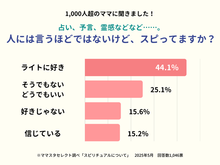 日本最大級のママ向け情報サイト「ママスタ」の情報発信メディア「ママスタセレクト」(運営:株式会社インタースペース、代表取締役社長:河端伸一郎、証券コード:2122、以下インタースペース)は、「スピリチュアル」についてのアンケートを実施しました。