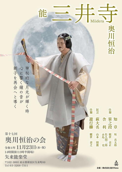 株式会社能のHana主催、第17回奥川恒治の会「三井寺」が2022年11月23日 (水・祝)に矢来能楽堂(東京都新宿区矢来町60)にて上演されます。