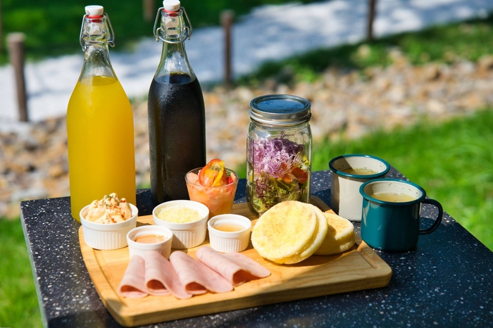 その日に仕込む温かい日替わりスープを片手に焚火をしながら、アツアツのマフィンサンドをお召し上がりください。
