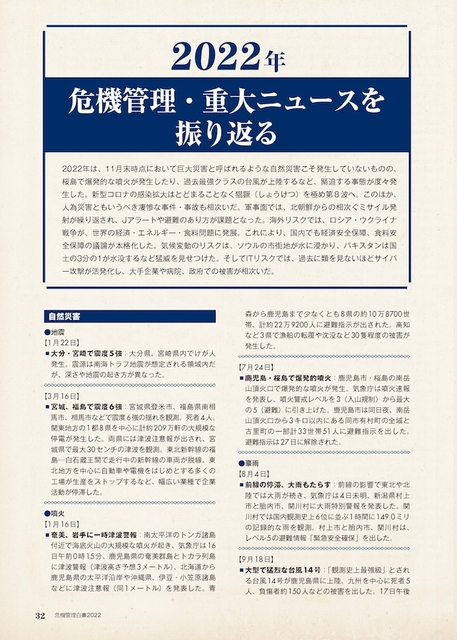 史上最強クラスの台風 、海外火山の噴火による津波、桜島の爆発的噴火、大規模通信の途絶、相次ぐ北朝鮮からの弾道ミサイル 、安倍元首相の銃撃、知床観光船事故、大規模サイバー攻撃、韓国・梨泰院の群集雪崩事故…